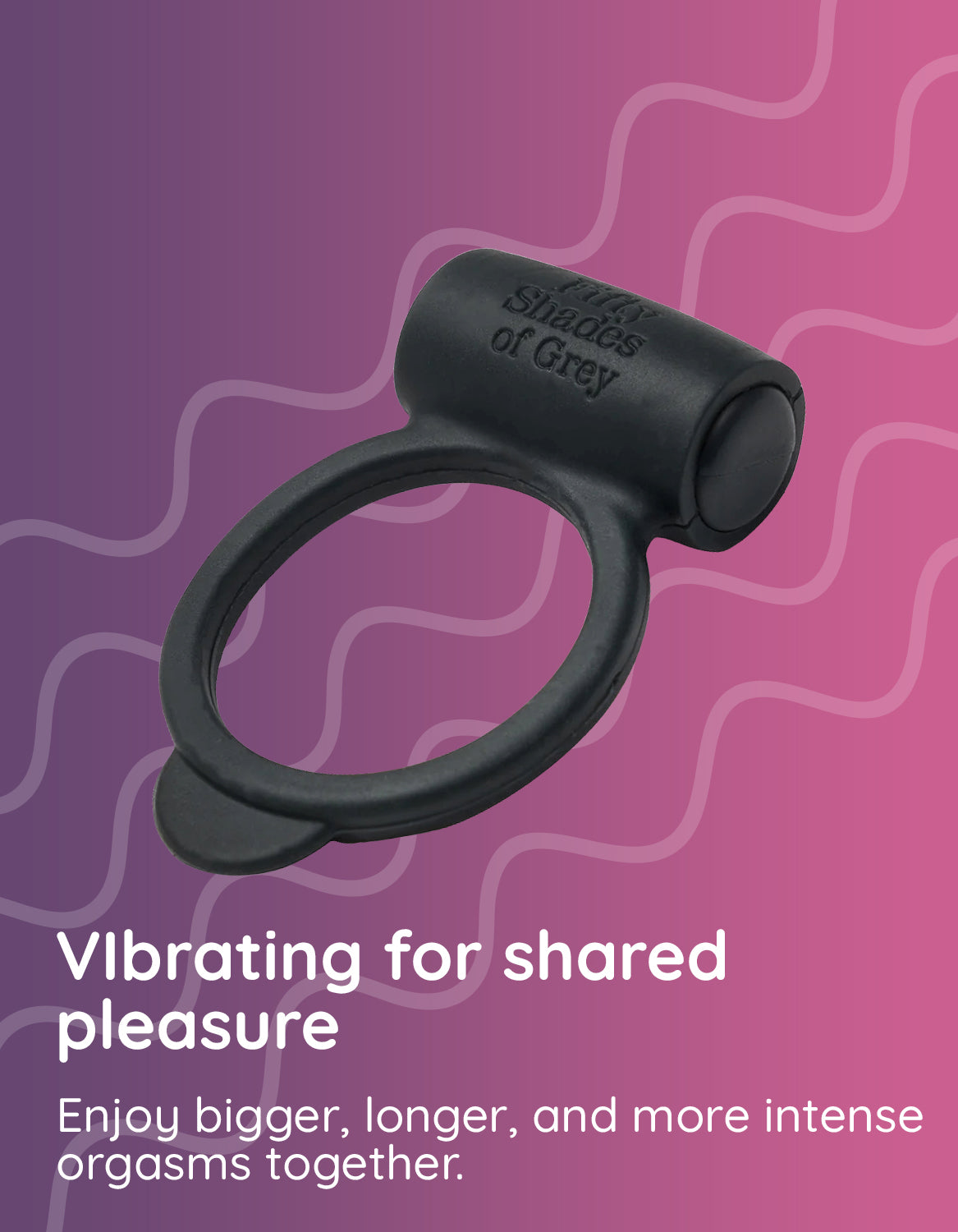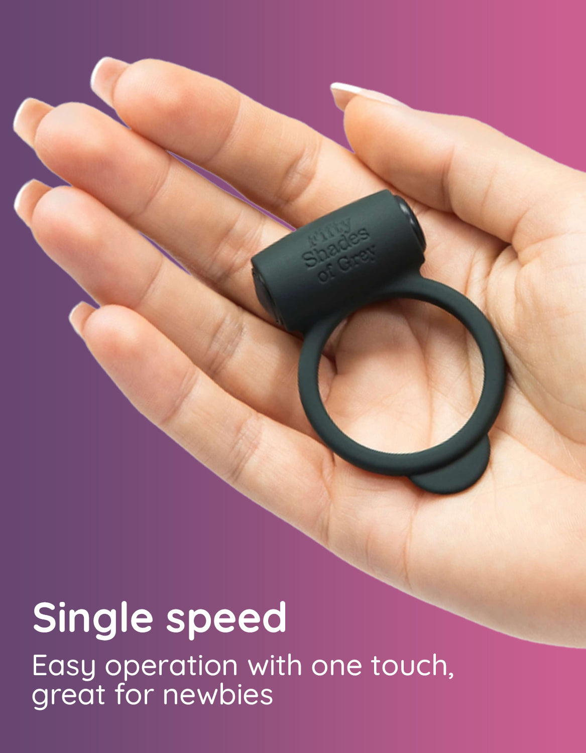 Fifty Shades of Grey Vibrating Love C-Ring is the just-right match for couples who want single-speed vibrations and amazing stimulation and sensations for both. Being in bed with someone is a shared experience and so you should share pleasure and pleasure tools, too. Make him wear the Yours and Mine ring at the base of his penis to give Him better erections while stimulating Her with gentle clitoral play.