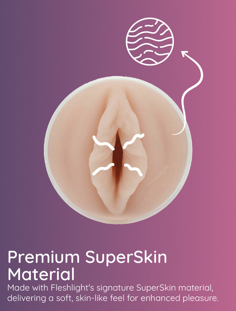 The masturbator is made with ultra-safe, super skin that replicates the texture of real skin, and warms with usage like real skin. You can even warm the sleeve for some temperature play with warm water but refrain from putting this in the microwave or oven. The masturbator boasts supple dimensions of 10 inches total length and 3 inches of canal girth. Each Fleshlight Girls box includes a unique Fleshlight Pearlescent Case, Fleshlight Girls sleeve, Instruction/Care manual, and a sample of water-based lubricant.