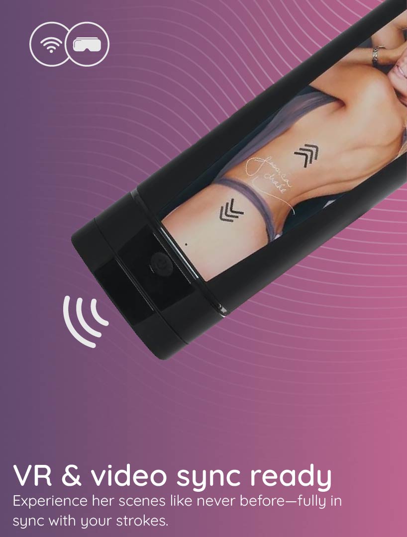 The lightweight Onyx+ with Jessica Drake’s touch boasts 10 rings in the inner walls of the sleeve that work in perfect harmony to stimulate real-life-like sensations enthralling intercourse, stroking your penis sensually in real-time. The masturbator offers up to 140 strokes per minute while the whisper-quiet motor works effortlessly to produce powerful vibrations for enhancing your pleasure- solo or partnered sex. Experience a flash of exciting interactive experience as the device works on your penis to induce you with some incomparable delicious sensations, combined with multiple videos that come pre-programmed with the device, along with a complimentary video by the superstar Jessica Drake herself. Enhanced with a video chat platform, open yourself up to ceaseless exciting possibilities. Pair up your KIIROO with your favorite interactive content; erotic video, virtual reality, and webcam partner sites.