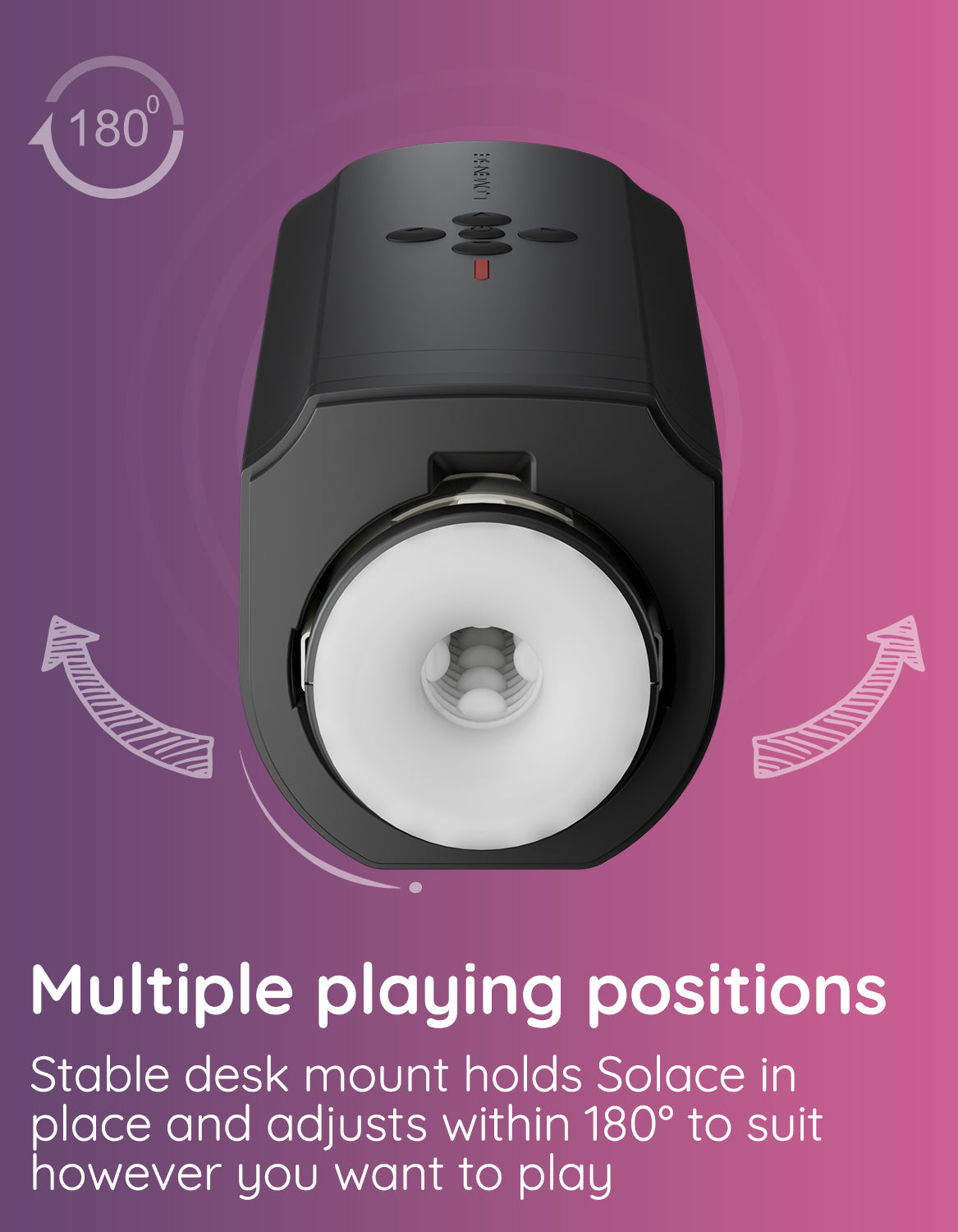 Customization is key for an ideal pleasure. Adjust the depth of the strokes to suit your preferences, with a maximum depth of 2.75 inches. And thanks to the stable desk mount, you can explore multiple playing positions, finding the perfect angle for your pleasure. Worried about running out of power? Don't be! As Solace is ready when you are, and only stops when you do. As it offers an unbelievable 12.5 hours of playtime on a single charge of less than 2 hours (100 minutes). Cleaning up after your adventures is a breeze with Solace's convenient flip-open sleeve holder. Simply remove and wash the sleeve, no need to wash whole toy under the water. Toy is splash-proof. And speaking of sleeves, the included neutral sleeve features tantalizing nubs and ridges, adding extra stimulation to your pleasure sessions.